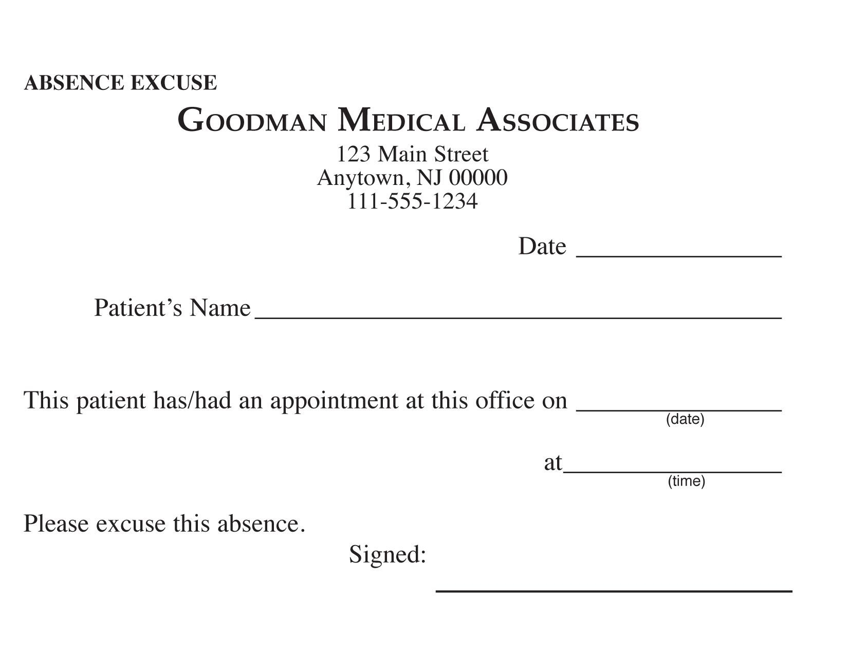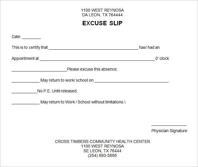 Download and Print Free Printable Work Excuse Template Listed below